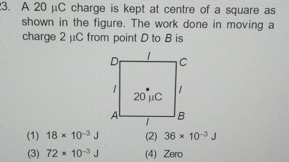 Basic Physics23 A 20 C charge is kept at centre of a square as shown in the figure The work done in moving a charge 2 C from point D to B is 7 C 1 18 x 10 J 3 72 10 3 J D 1 A 20 C 2 36 10 J 4 Zero