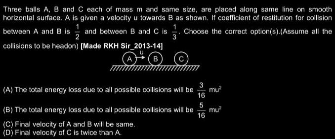 Work, power & energyThree balls A B and C each of mass m and same size are placed along same line on smooth horizontal surface A is given a velocity u towards B as shown If coefficient of restitution for collision 1 between A and B is and between B and C is Choose the correct option s Assume all the 1 2 3 collisions to be headon Made RKH Sir 2013 14 AB 3 A The total energy loss due to all possible collisions will be 16 5 B The total energy loss due to all possible collisions will be mu 16 C Final velocity of A and B will be same D Final velocity of C is twice than A mu