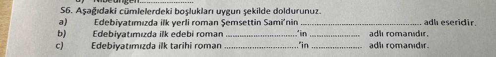 a) 56. Aşağıdaki cümlelerdeki boşlukları uygun şekilde doldurunuz. Edebiyatımızda ilk yerli roman Şemsettin Sami'nin b) Edebiyatımızda ilk edebi roman ...... 'in Edebiyatımızda ilk tarihi roman .'in .... adlı eseridir. adlı romanıdır. adlı romanıdır. c) . ...