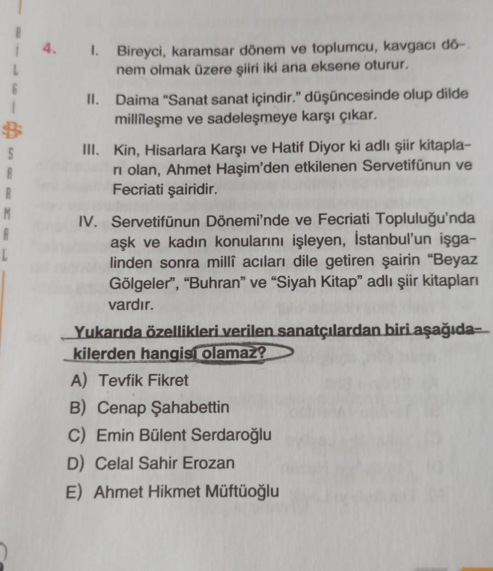 i 4. 1. Bireyci, karamsar dönem ve toplumcu, kavgacı dő- L nem olmak üzere şiiri iki ana eksene oturur. 6 1 II. Daima "Sanat sanat içindir." düşüncesinde olup dilde millîleşme ve sadeleşmeye karşı çıkar. 5 III. Kin, Hisarlara karşı ve Hatif Diyor ki adlı şiir kitapla- ri olan, Ahmet Haşim'den etkilenen Servetitünun ve R Fecriati şairidir. M IV. Servetifünun Dönemi'nde ve Fecriati Topluluğu'nda A aşk ve kadın konularını işleyen, İstanbul'un işga- L linden sonra millî acıları dile getiren şairin “Beyaz Gölgeler”, “Buhran” ve “Siyah Kitap" adlı şiir kitapları vardır. Yukarıda özellikleri verilen sanatçılardan biri aşağıda- kilerden hangisi olamaz? A) Tevfik Fikret B) Cenap Şahabettin C) Emin Bülent Serdaroğlu D) Celal Sahir Erozan E) Ahmet Hikmet Müftüoğlu
