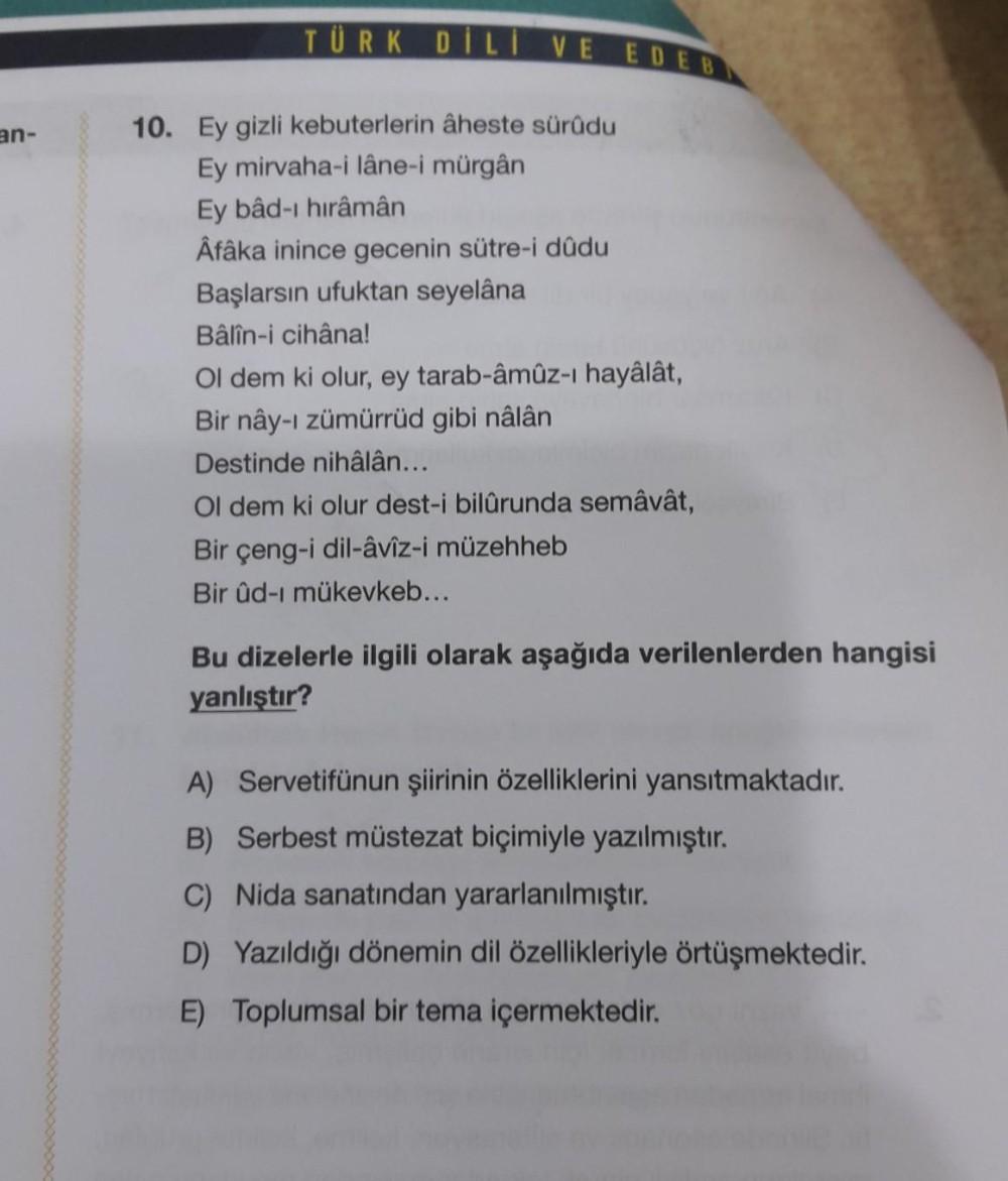 TÜRK DİLİ VE EDEB an- 10. Ey gizli kebuterlerin âheste sürüdu Ey mirvaha-i lâne-i mürgân Ey bâd-ı hırâmân Âfâka inince gecenin sütre-i důdu Başlarsın ufuktan seyelâna Bâlîn-i cihâna! Ol dem ki olur, ey tarab-âmûz-ı hayâlât, Bir nây-ı zümürrüd gibi nâlân Destinde nihâlân... Ol dem ki olur dest-i bilûrunda semâvât, Bir çeng-i dil-âvîz-i müzehheb Bir âd-ı mükevkeb... Bu dizelerle ilgili olarak aşağıda verilenlerden hangisi yanlıştır? A) Servetifünun şiirinin özelliklerini yansıtmaktadır. B) Serbest müstezat biçimiyle yazılmıştır. C) Nida sanatından yararlanılmıştır. D) Yazıldığı dönemin dil özellikleriyle örtüşmektedir. E) Toplumsal bir tema içermektedir.